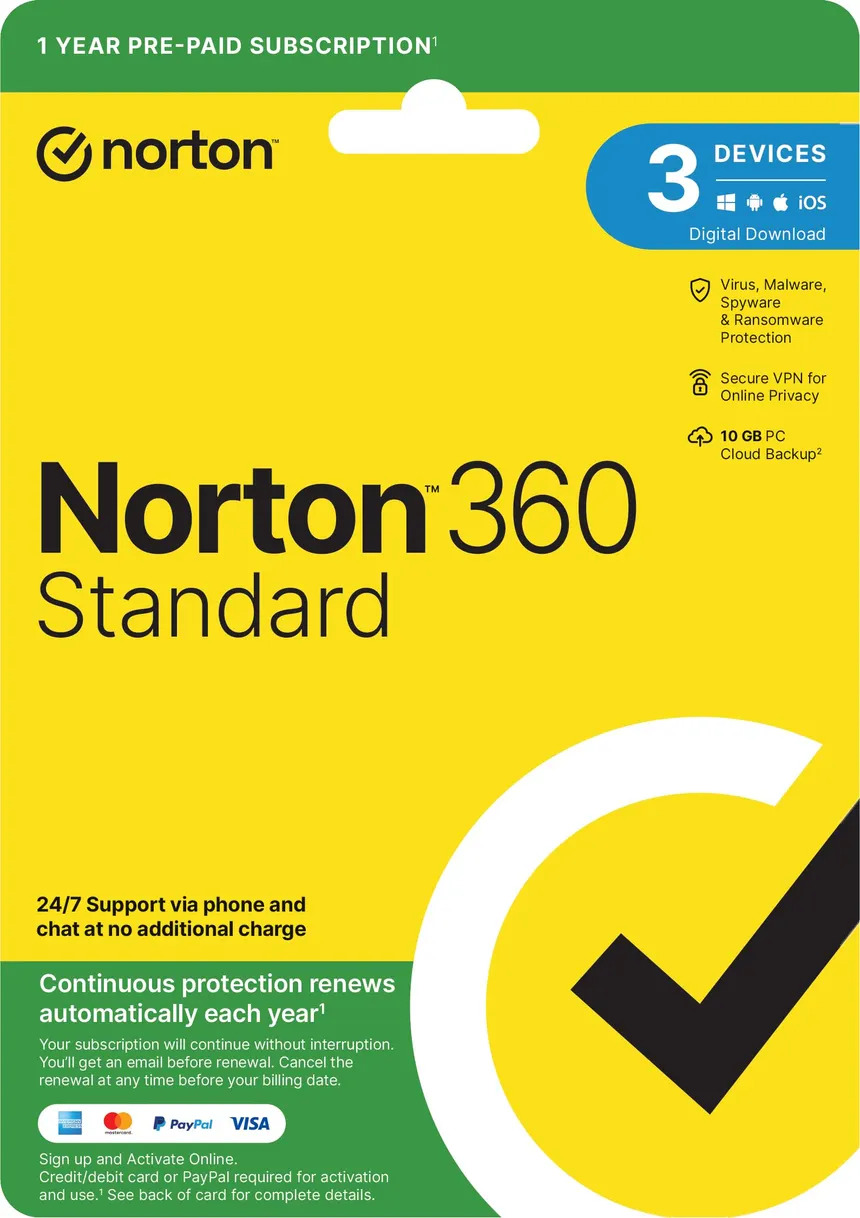 Norton 360 Standard provides protection for up to 3 PCs, Macs, Android devices, or iOS devices.